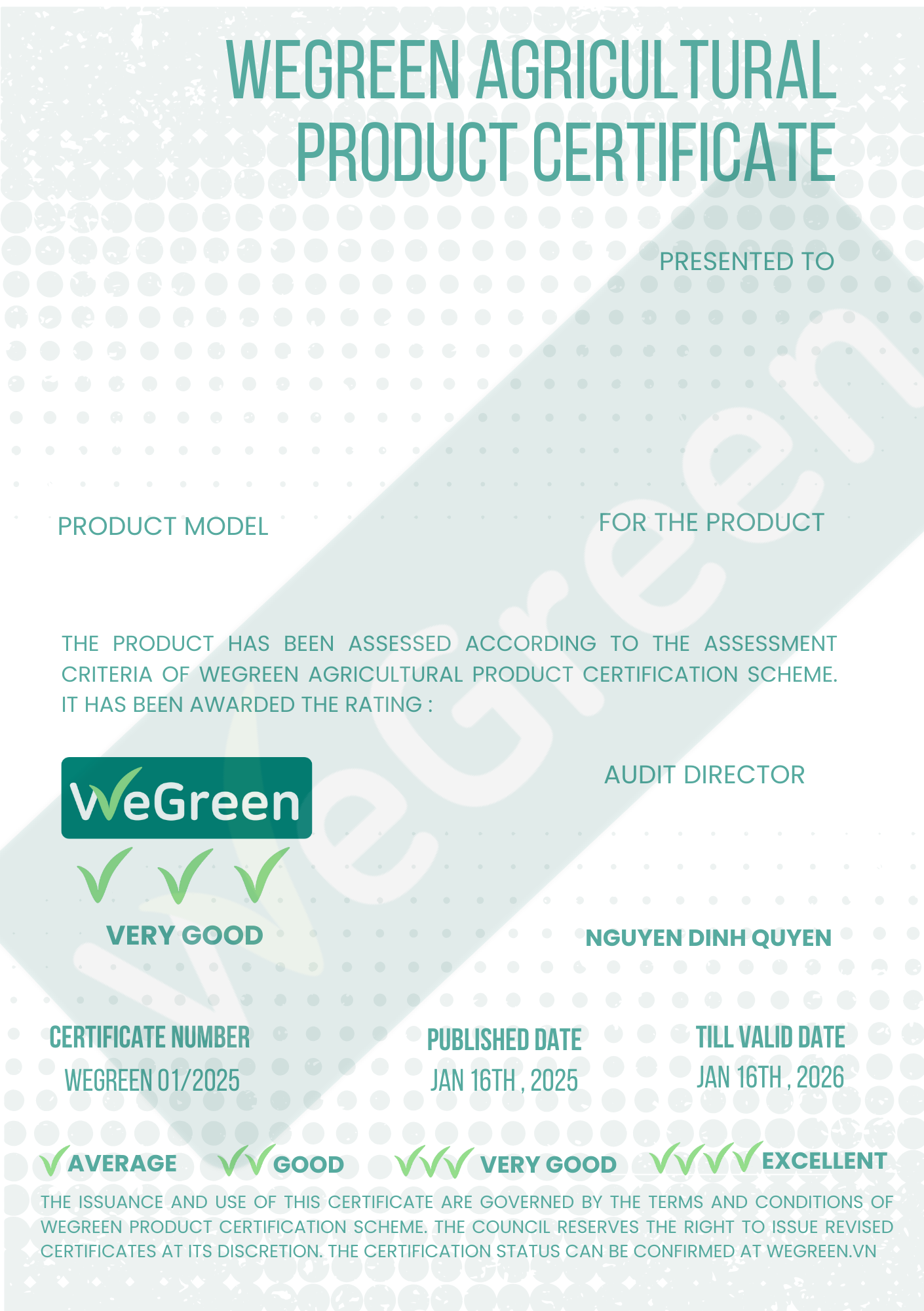 Với mục tiêu cao cả là thúc đẩy sản xuất và kinh doanh bền vững, WeGreen hướng tới việc đảm bảo rằng các sản phẩm và dịch vụ không chỉ đáp ứng các tiêu chuẩn chất lượng quốc tế mà còn được tạo ra theo cách bảo vệ môi trường, nâng cao đời sống cộng đồng và thúc đẩy trách nhiệm xã hội trong toàn bộ chuỗi giá trị.